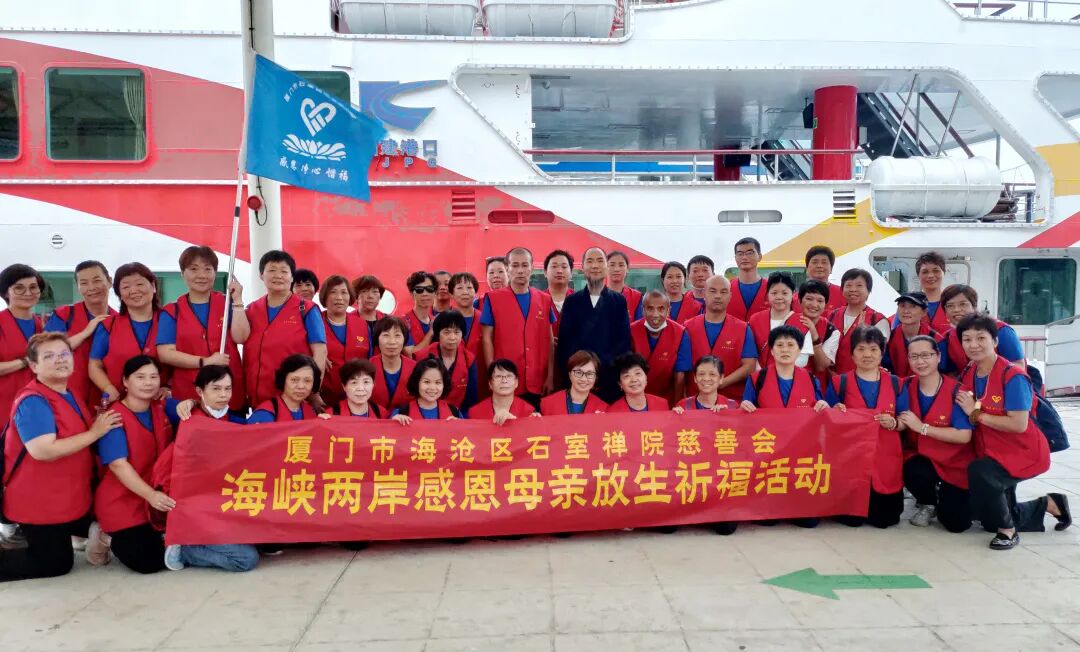 下午15时,石室禅院慈善会义工在会长忠明法师的带领下,乘坐游轮前往厦金海域,举行放生活动。