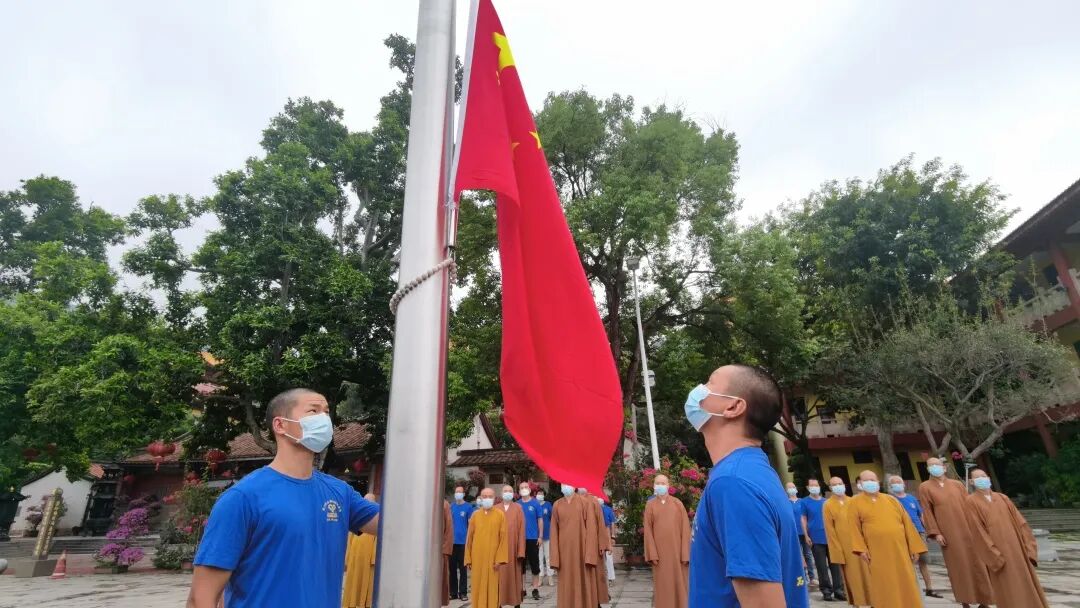 丹桂飘香,清风送爽,值逢祖国七十二华诞,厦门石室禅院于10月1日上午8时30分举行了庄严的升国旗仪式。当中华人民共和国国歌响起,鲜艳的五星红旗迎风冉冉上升,石室禅院全体僧众及义工在嘹亮的国歌声中,向国旗行注目礼。庄严的国旗不仅高高飘扬在寺院上空,也飘扬在广大信众的心中。