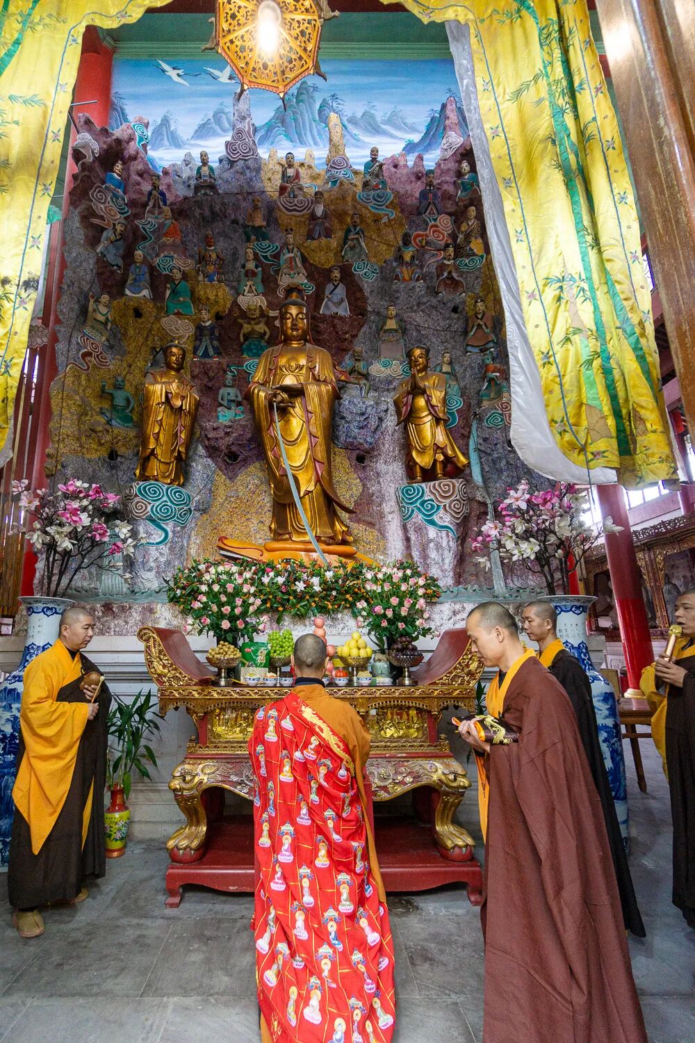 是时,大雄宝殿之内,大众依次整齐排班,幢幡林立、梵音清越、香气四溢、清净庄严。上忠下明大和尚率四众弟子虔诚顶礼诸佛菩萨,持诵大悲咒,发愿忏悔,称念观世音菩萨圣号,至诚祈愿观世音菩萨以大悲之力拔除众生之苦,以大慈愿力给予众生喜乐,至诚祈愿观世音菩萨加持疫情早日消散,佛光普照、国泰民安。