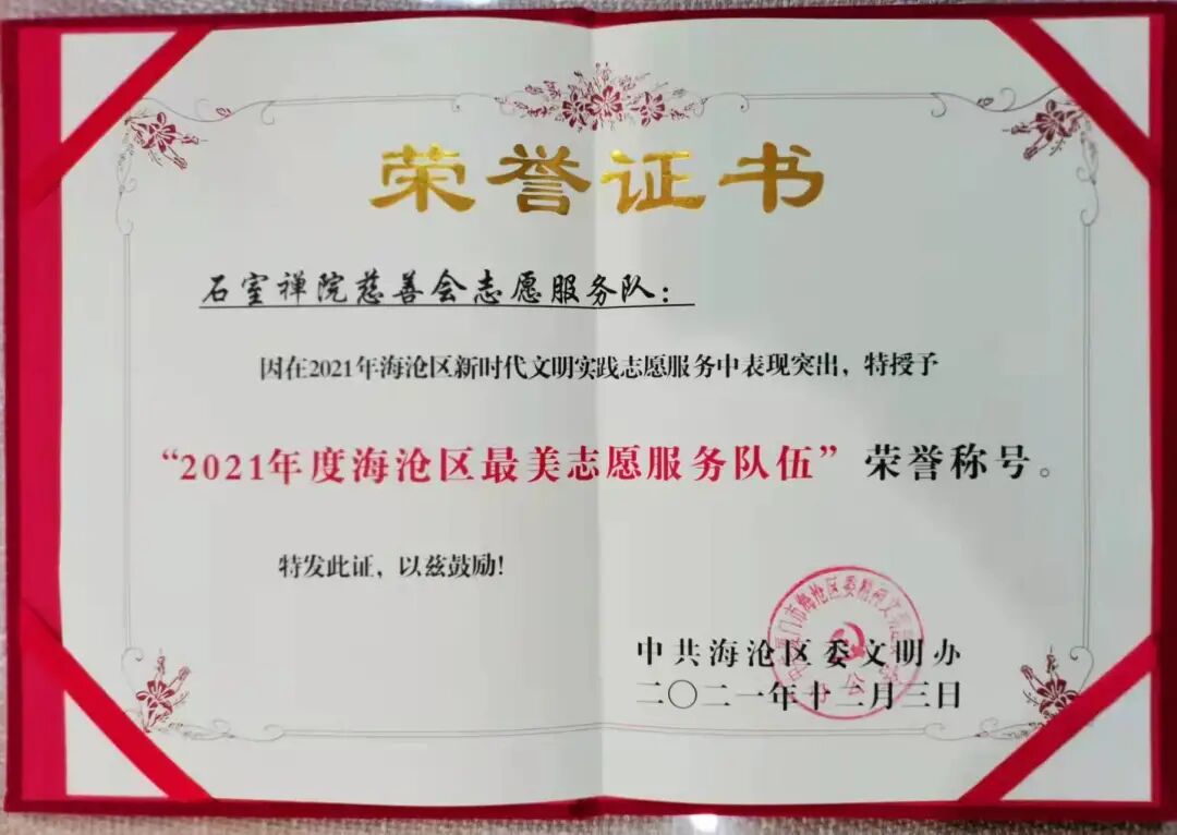 因在2021年海沧区新时代文明实践志愿服务中表现突出,石室禅院慈善会义工团被海沧区委文明办授予“2021年度海沧区最美志愿服务队伍”荣誉称号。