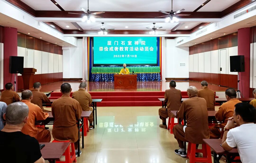 2022年7月10日,石室禅院组织全体法师、工作人员及常住义工在本寺弘法讲堂召开“崇俭戒奢教育活动”动员部署会。住持忠明法师主持此次会议。