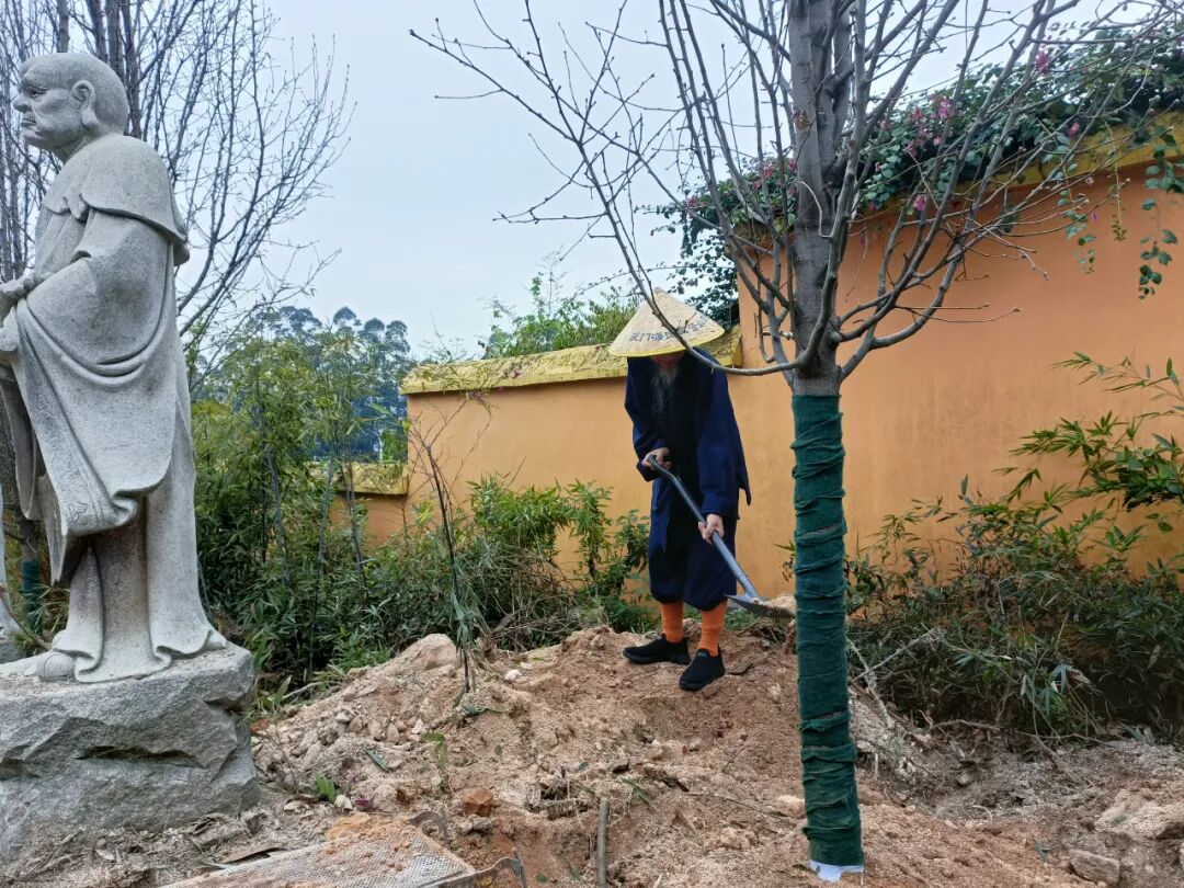 众卉始新万物发,不负春光不负时。2024年3月14日上午,旭日和风,枝头新绿初吐,一派生机盎然的景象,石室禅院的罗汉大道上,本寺住持忠明法师带领常住人员一起动手,挥锹铲土,修枝扶苗,培实浇水,经过一番辛勤忙碌,新栽的20棵梨花树亭亭而立,相信不久以后,这些新栽的梨花树将会成长为石室禅院新的靓丽风景线。